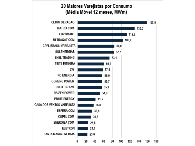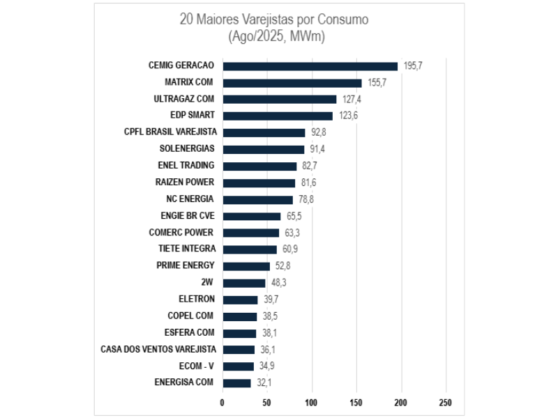 Outros destaques vão para CPFL Brasil Varejista e Solenergias, que continuam com presença sólida e consumo superior a 91 MWm, mantendo-se firmes na zona intermediária alta do ranking.