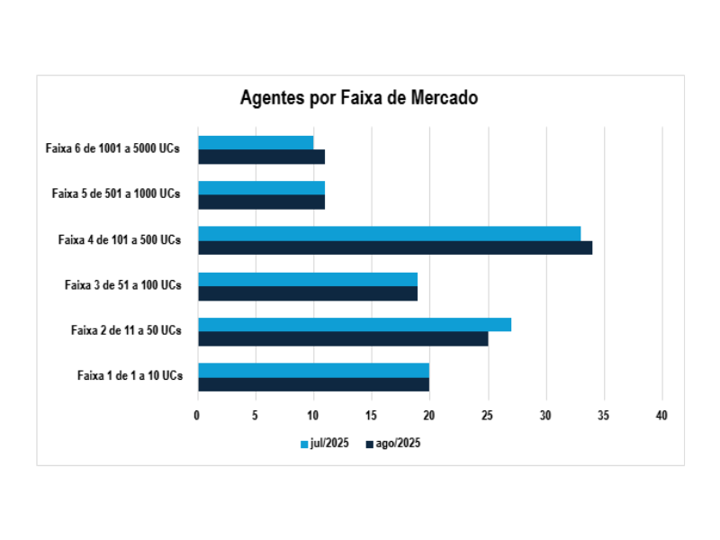- A faixa de 101 a 500 UCs segue como a mais representativa do mercado, com 36 agentes ativos em agosto — um a menos que o registrado em julho (37). O dado pode sinalizar uma leve retração ou estabilização, após meses de forte crescimento nessa camada.