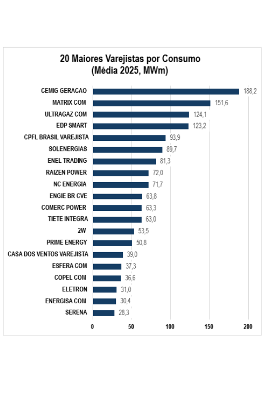 - CEMIG Geração segue soberana no topo do ranking, com 188,2 MWm de consumo médio nos últimos 12 meses — um avanço expressivo frente ao mês anterior. A comercializadora reafirma sua posição como principal referência do modelo varejista no mercado livre, com escala e robustez.