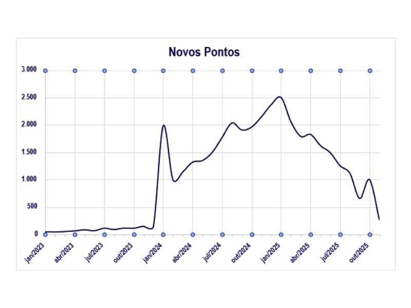 O gráfico abaixo ilustra essa trajetória: desde o pico em fevereiro de 2024, o volume de novos pontos vem apresentando uma queda progressiva, refletindo mudanças no ritmo de entrada de novos consumidores no ACL (Ambiente de Contratação Livre).