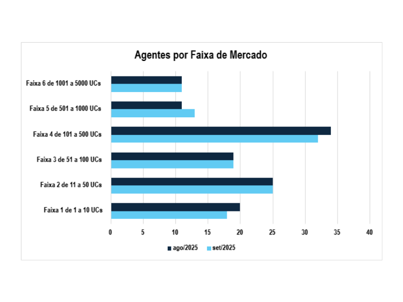 - A faixa de 101 a 500 UCs segue como a mais representativa do mercado, agora com 33 agentes ativos, uma leve redução em relação aos 34 registrados no mês anterior. Ainda assim, essa faixa concentra o maior número de comercializadoras com operação ativa, reforçando seu papel como principal porta de entrada no ACL. Essa estabilidade pode indicar o início de uma transição do mercado para um novo ciclo de consolidação.