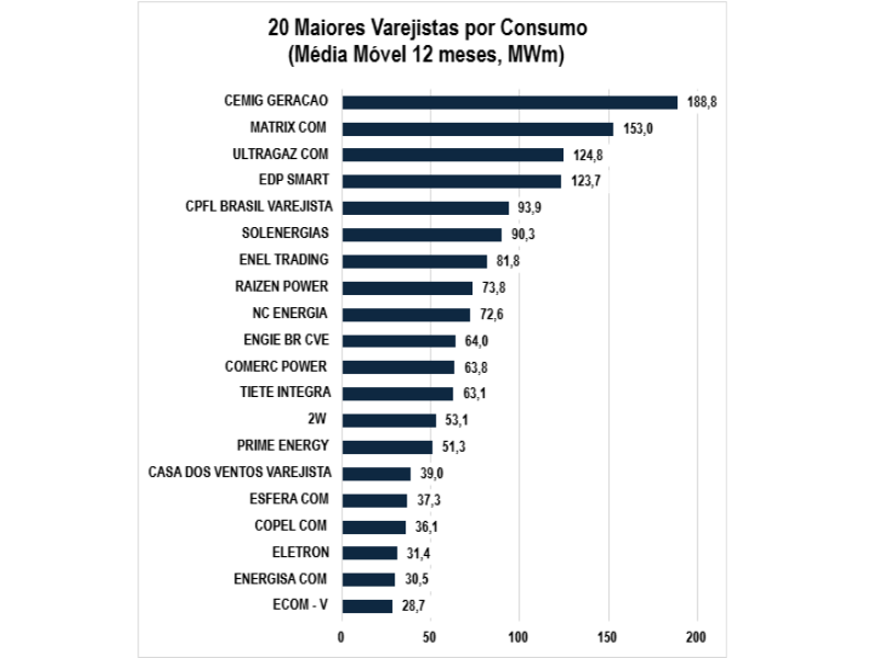 A Matrix COM aparece em segundo lugar, com 153 MWm, consolidando o avanço não apenas em UCs, mas também em volume agregado. Isso reforça a solidez do crescimento da empresa ao longo do ano. Já a Ultragaz COM, que lidera em UCs, ocupa a terceira posição no consumo, com 124,9 MWm, o que indica uma carteira mais pulverizada, com foco em clientes de menor porte.