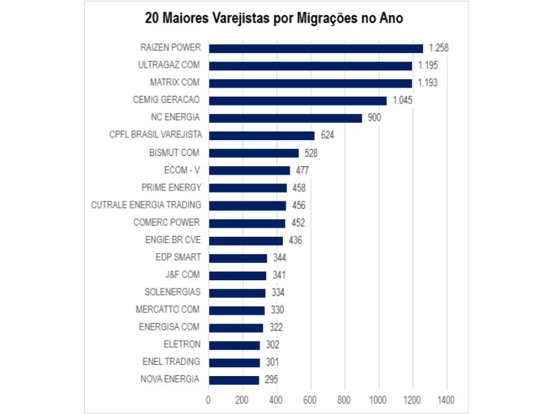 Logo atrás, a Ultragaz COM aparece com 1.195 migrações no ano, demonstrando consistência entre aquisição e manutenção de clientes. Em terceiro lugar, a Matrix COM soma 1.193 migrações, reafirmando sua posição como uma das comercializadoras mais agressivas do ano em ativação de mercado.