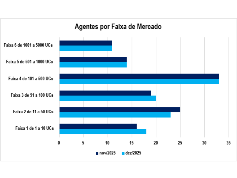 • A Faixa 4 (de 101 a 500 UCs) permanece como a mais representativa do mercado, com 33 agentes, indicando forte concentração no grupo intermediário;