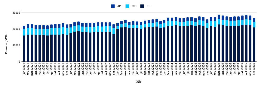 O gráfico atualizado demonstra que, mesmo com a variação entre novembro e dezembro, o consumo no ACL permanece dentro da faixa elevada consolidada ao longo de 2025. Ou seja, não se trata de uma mudança de tendência, mas sim de uma oscilação natural dentro de um ciclo já estabilizado em níveis altos.