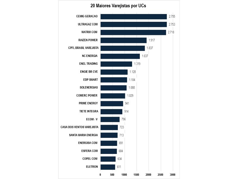 Além disso, ECOM-V (796 UCs), Casa dos Ventos Varejista (723 UCs) e Santa Maria Energia (713 UCs) mantêm presença importante entre os vinte maiores varejistas.