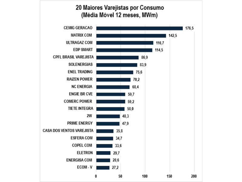 Na parte final do ranking aparecem Casa dos Ventos Varejista (35,8 MWm), Esfera COM (34,7 MWm), Copel COM (33,6 MWm) e Eletron (29,7 MWm). Fechando a lista, surgem Energisa COM (28,6 MWm) e ECOM-V (27,2 MWm).